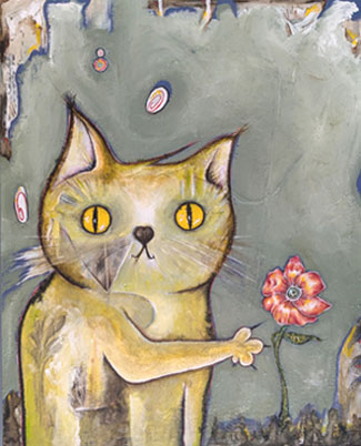 mixed media (bits of vintage dictionary and hymn pages, washi tape, colored pencils, acrylic paint, watercolors, bits of various scrap paper, ink) on wood panel, 16" x 20", SOLD