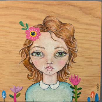 "Flower Girl" "Flower Girl", mixed media (colored pencils, ink, collage paper) on reclaimed wood, 6" x 6", SOLD