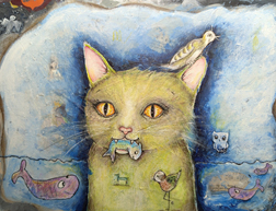"Go Fish with Noah" colored pencils, collage papers, watercolor & acrylic paint on wood panel, 9" x 12", SOLD