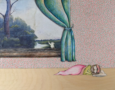 mixed media (colored pencils, photograph of a painting my grandmother created, collage paper, ink) on wood panel, 16" x 20", available for purchase
