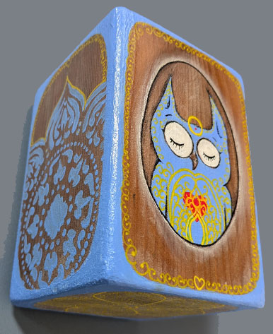 "Lokah Samastah Sukhino Bhavantu - May All Beings Be Content" acrylic paint on reclaimed wood, 3.5" x 3.5" x 5", SOLD