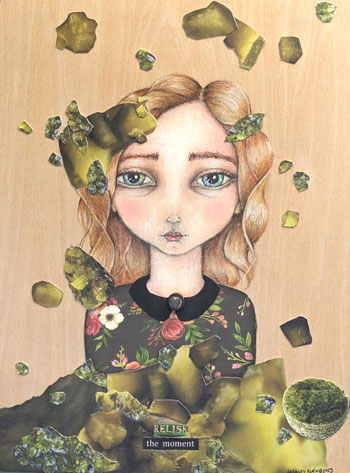 mixed media (colored pencils, button, heart charm, acrylic paint, collage paper, ink) on wood panel, 9" x 12", SOLD