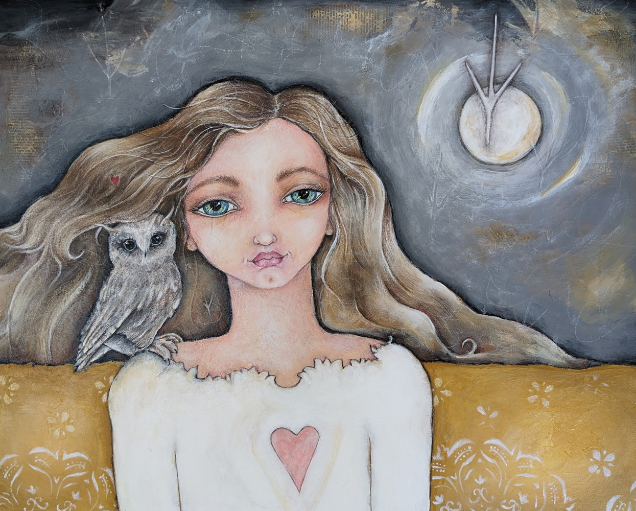 "Whispers" mixed media (colored pencils, acrylic paint, bits of scrap paper, ink) on wood panel, 16" x 20", SOLD